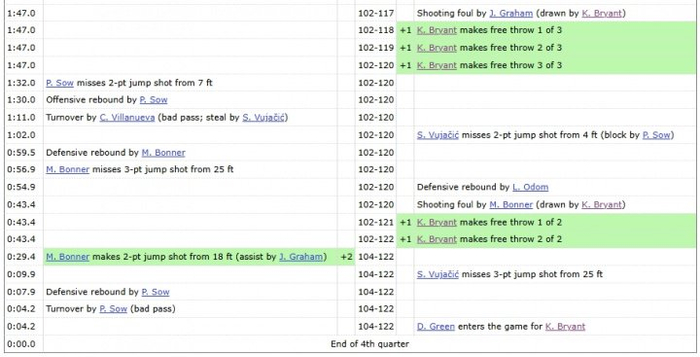 科比本场的四节得分依次为:14分、12分、27分、28分。科比在下半场狂砍55分,而猛龙全队仅得41分。最后2分钟,湖人117-102领先15分,科比在对手犯规下稳稳罚进5球,为球队锁定胜局。最终湖人在半场落后18分的情况下完成逆转。